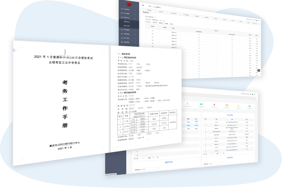 為解決考試中心考場(chǎng)安排和管理難題而推出的考試安排管理系統(tǒng)。幫助考試中心解決監(jiān)考老師無(wú)考前培訓(xùn)記錄、無(wú)合規(guī)性考試記錄、手動(dòng)編排考場(chǎng)安排難、考后數(shù)據(jù)統(tǒng)計(jì)困難的問(wèn)題。從監(jiān)考老師在線學(xué)習(xí)培訓(xùn)、合規(guī)性考試、考場(chǎng)安排、秩序冊(cè)生成到監(jiān)考記錄導(dǎo)出的全流程功能覆蓋,一站式解決大部分問(wèn)題。